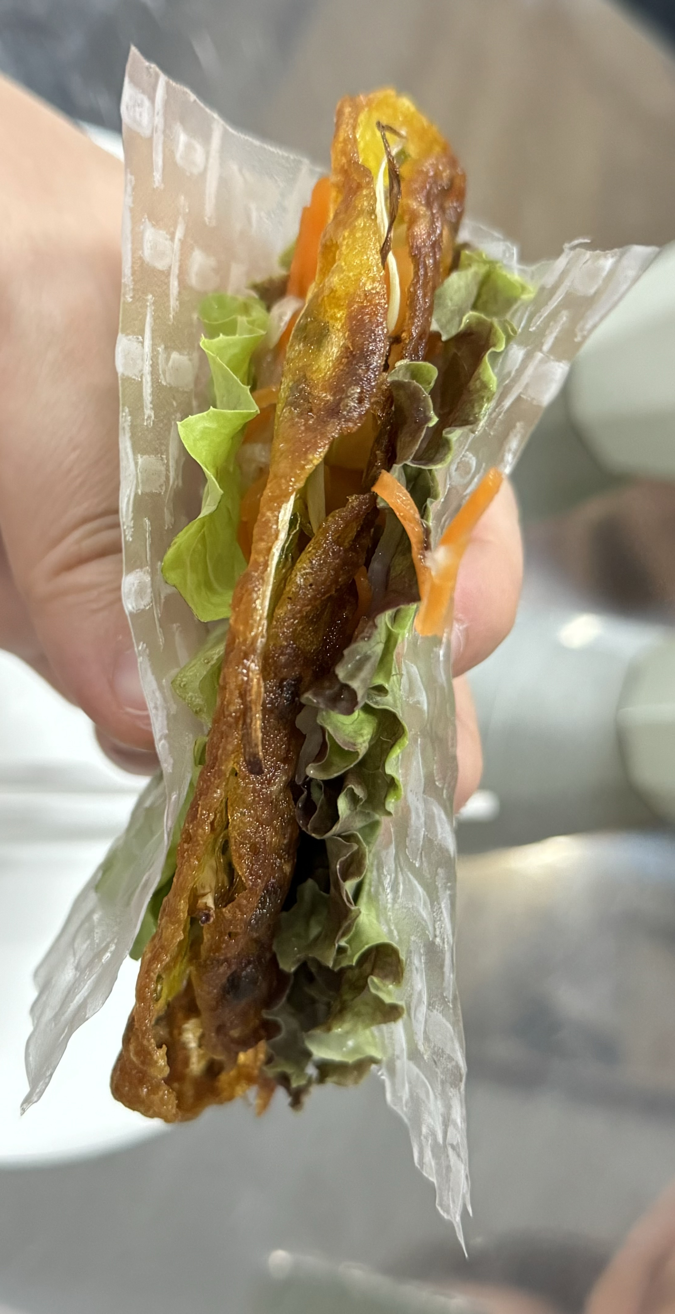 한 입 베어 물자 바삭한 식감이 먼저 터지고, 안쪽에서 고기와 채소의 풍미가 퍼졌습니다.