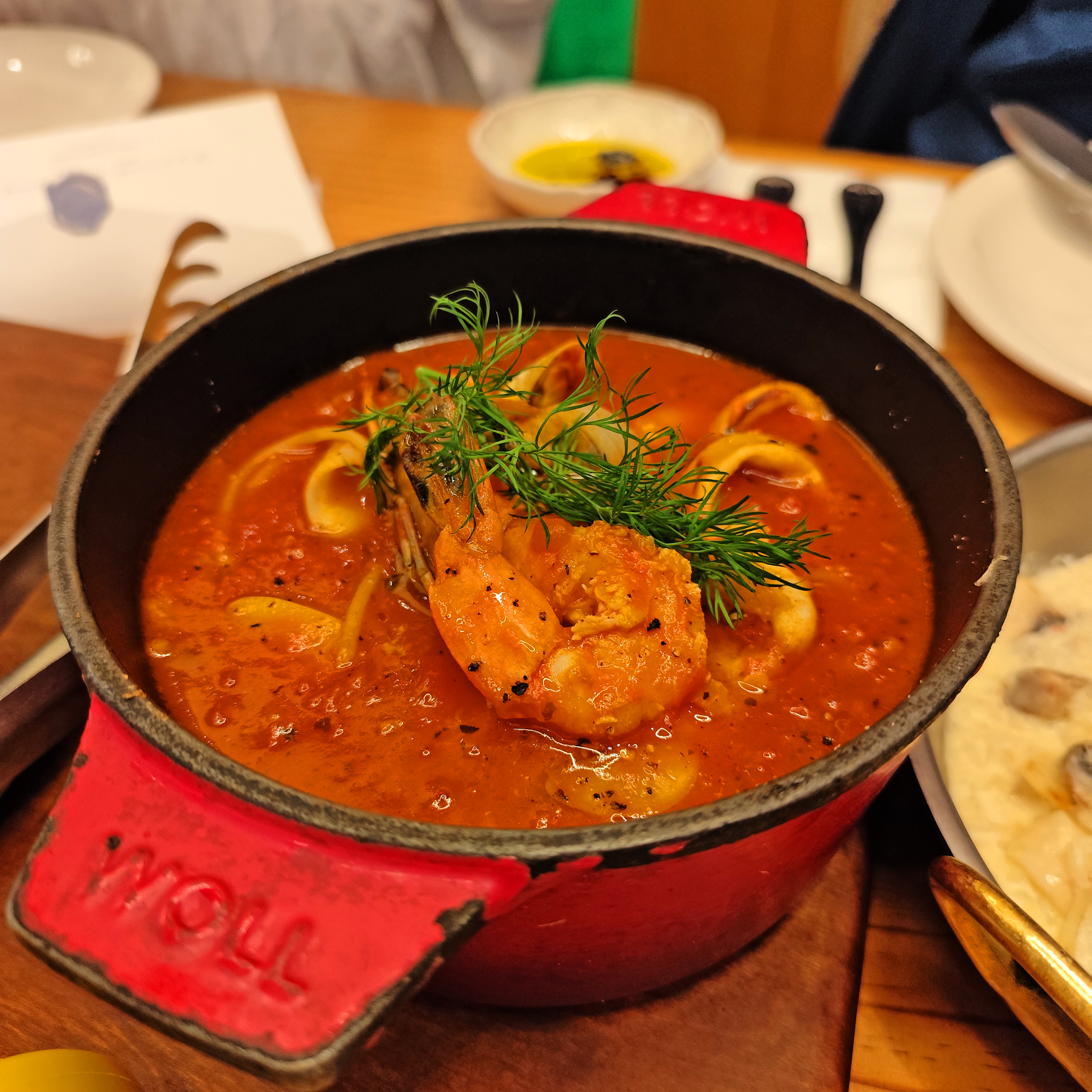 토마토 베이스에 해산물의 시원한 맛이 우러나와 얼큰하면서도 깔끔했고, 스푼으로 국물을 떠먹을 때마다 감칠맛이 가득 느껴졌습니다.