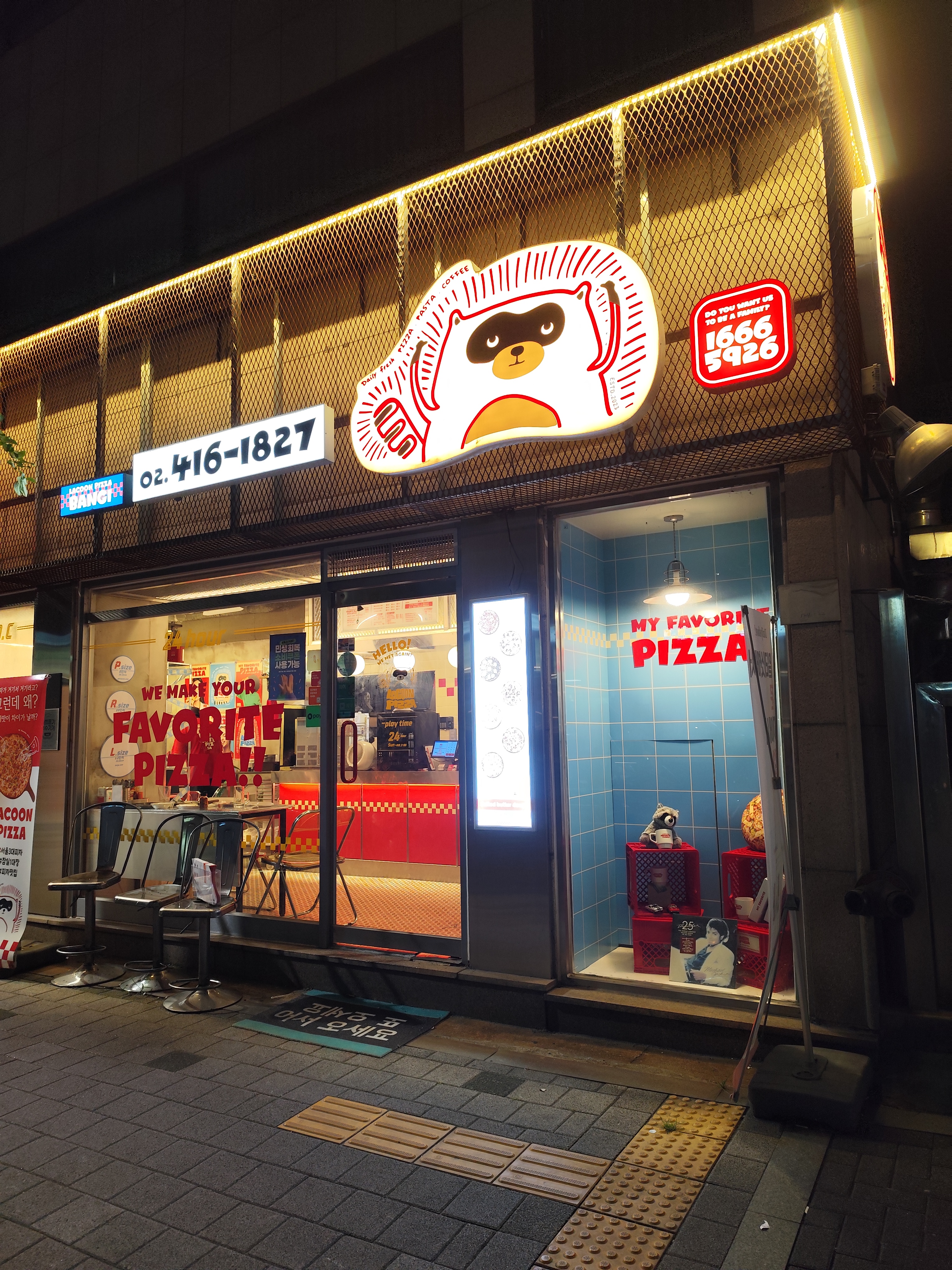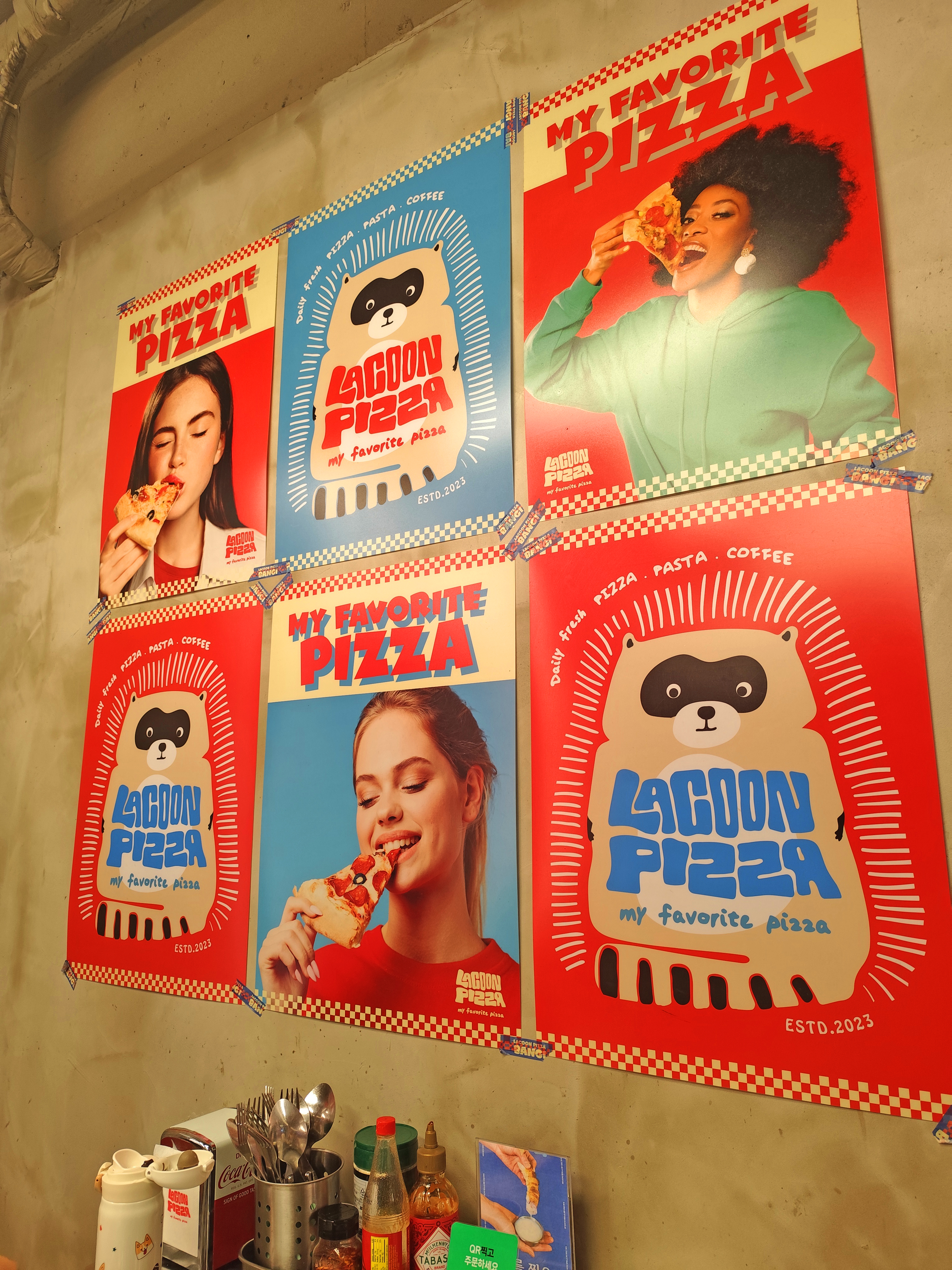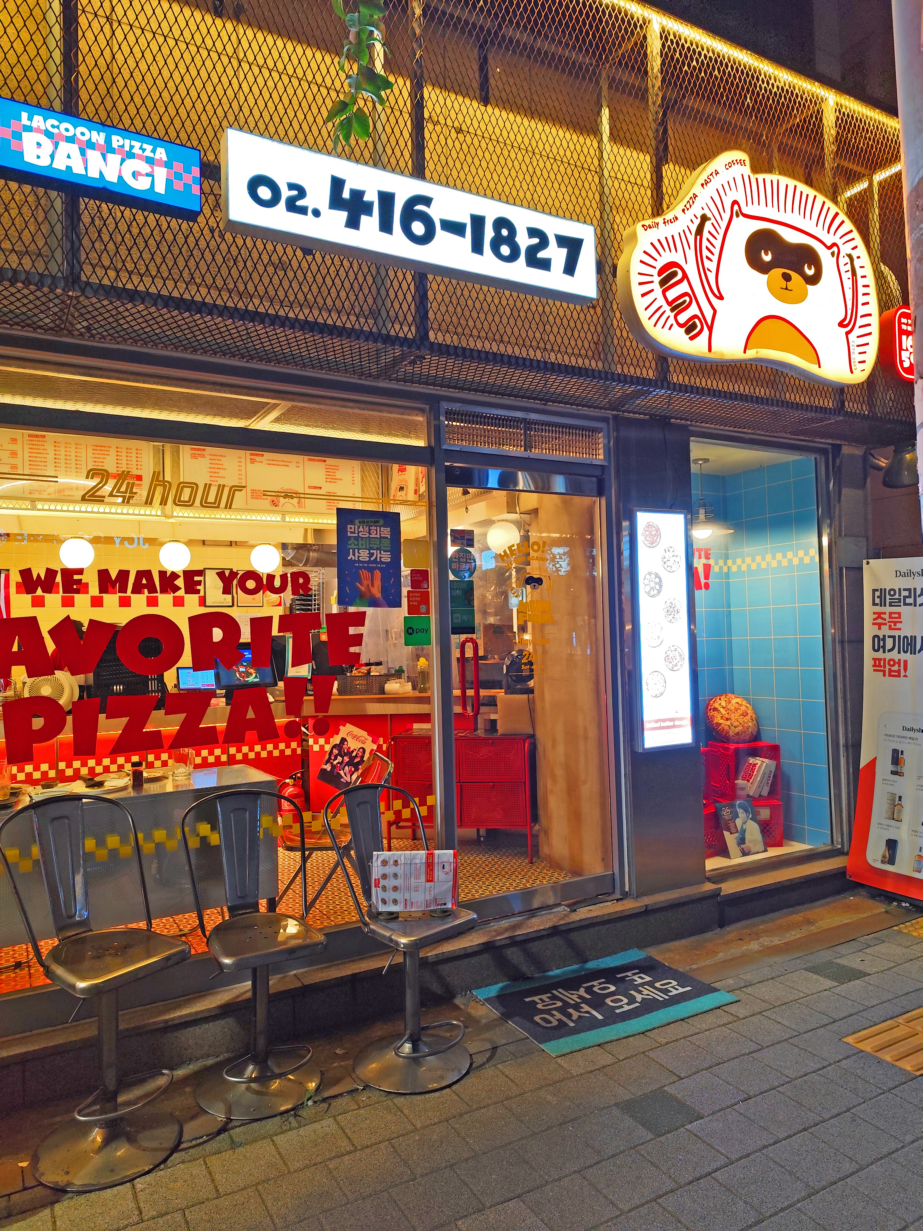 매장은 콘크리트 벽과 감각적인 네온/포스터 인테리어로 꾸며져 있습니다. 특히 벽에 붙은 라쿤 캐릭터와 레트로풍 포스터가 시선을 확 사로잡습니다. 마치 뉴욕 피자 가게에 들어온 듯한 느낌을 주는데, 사진 찍기에도 딱 좋더라고요.