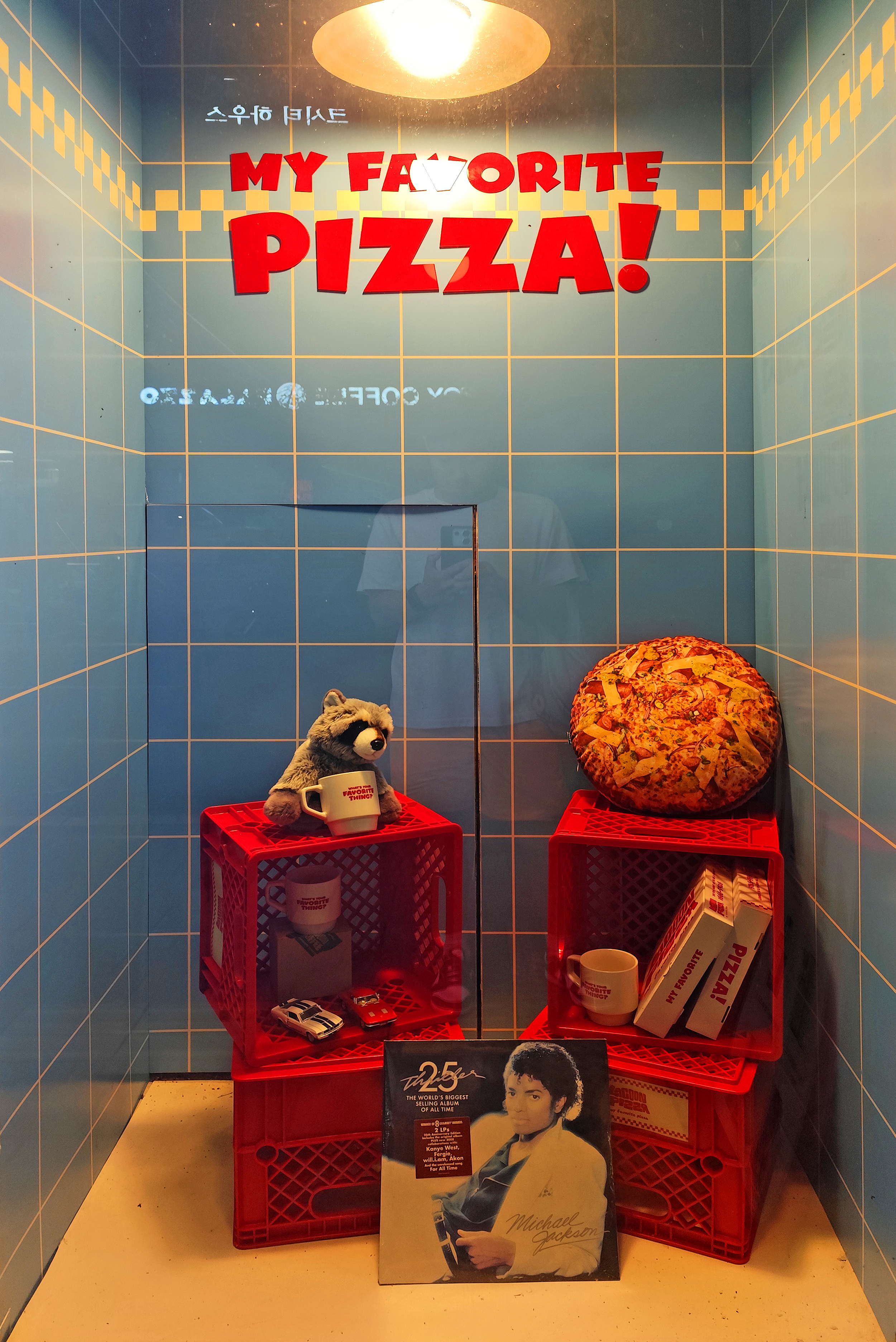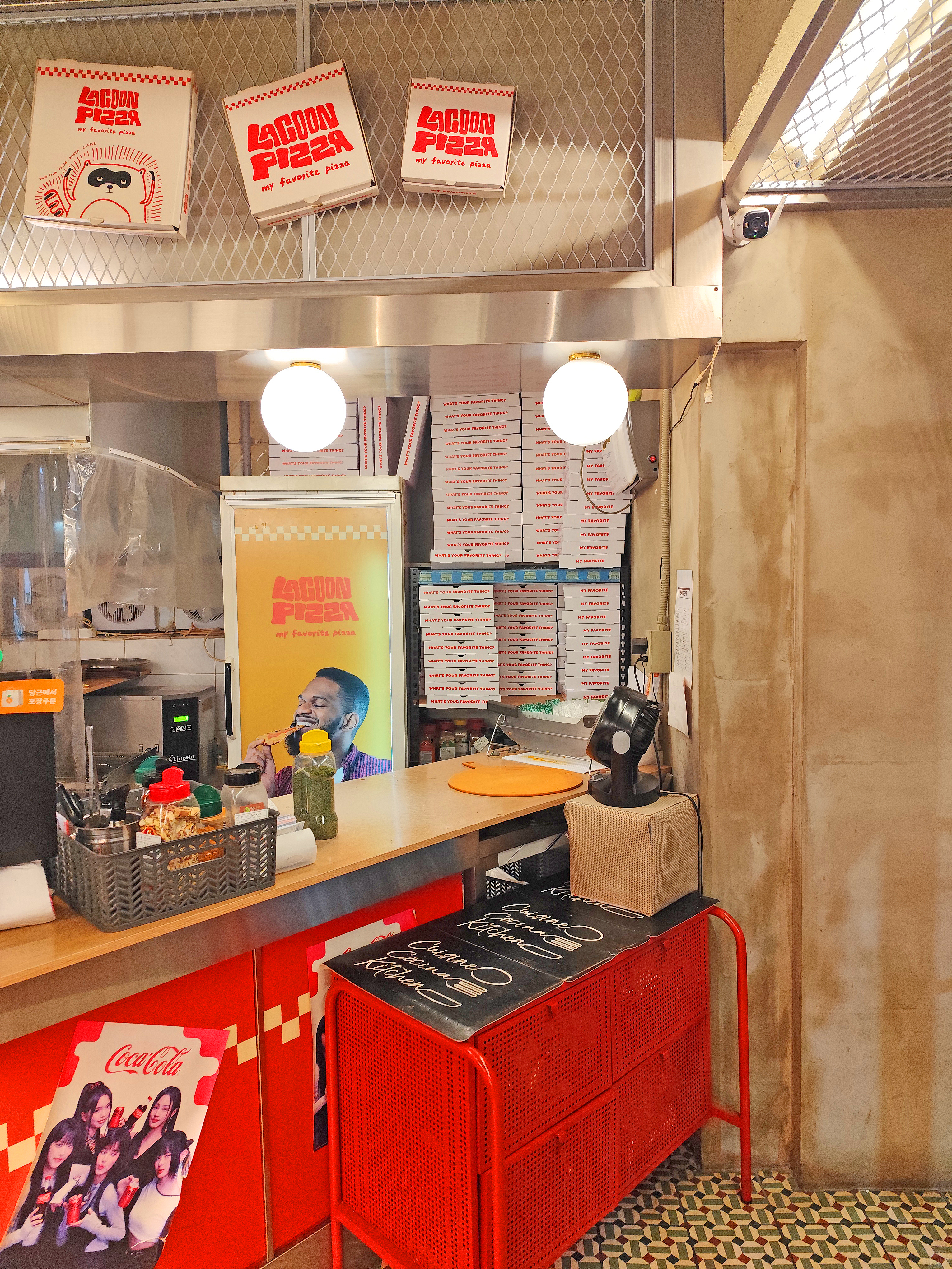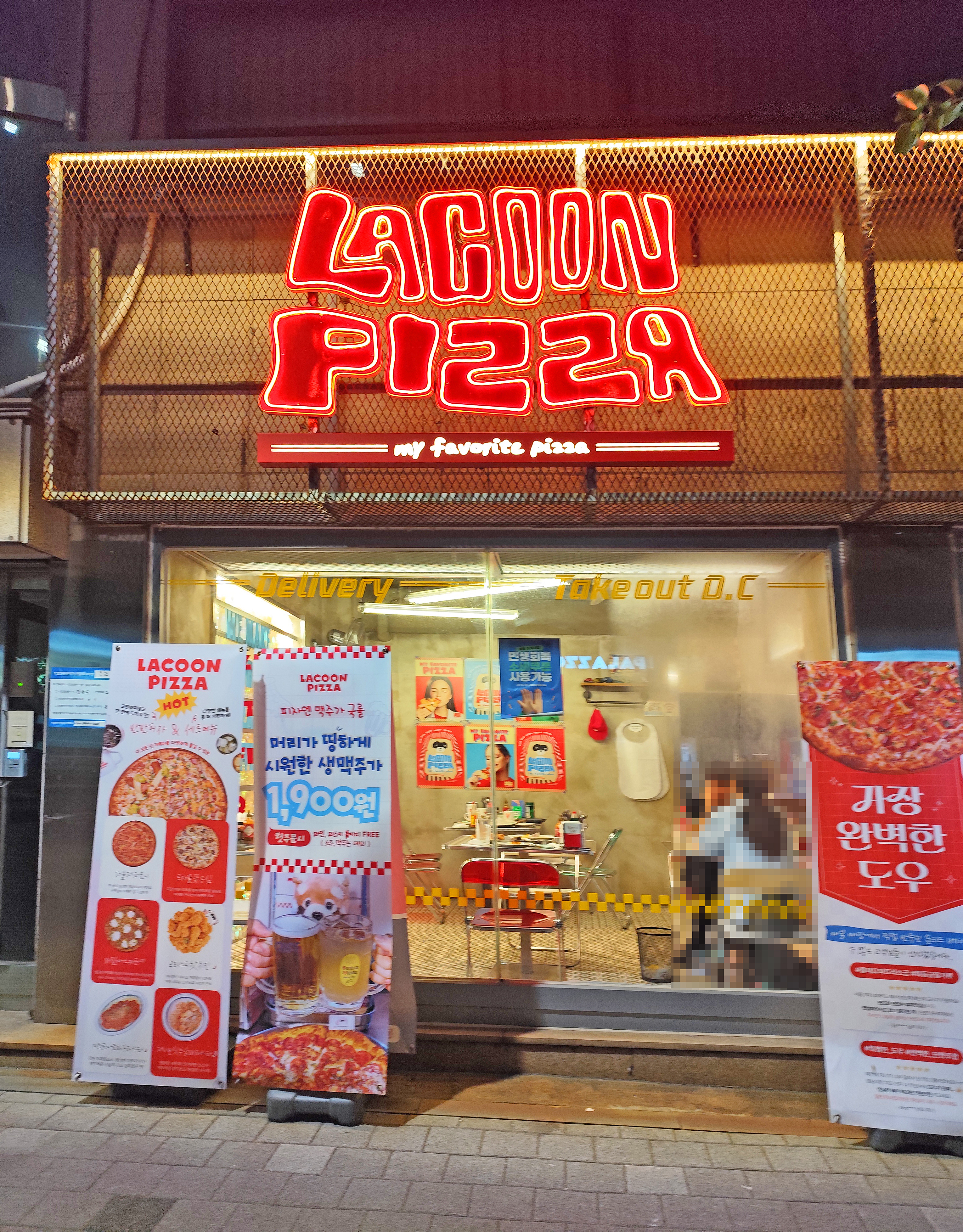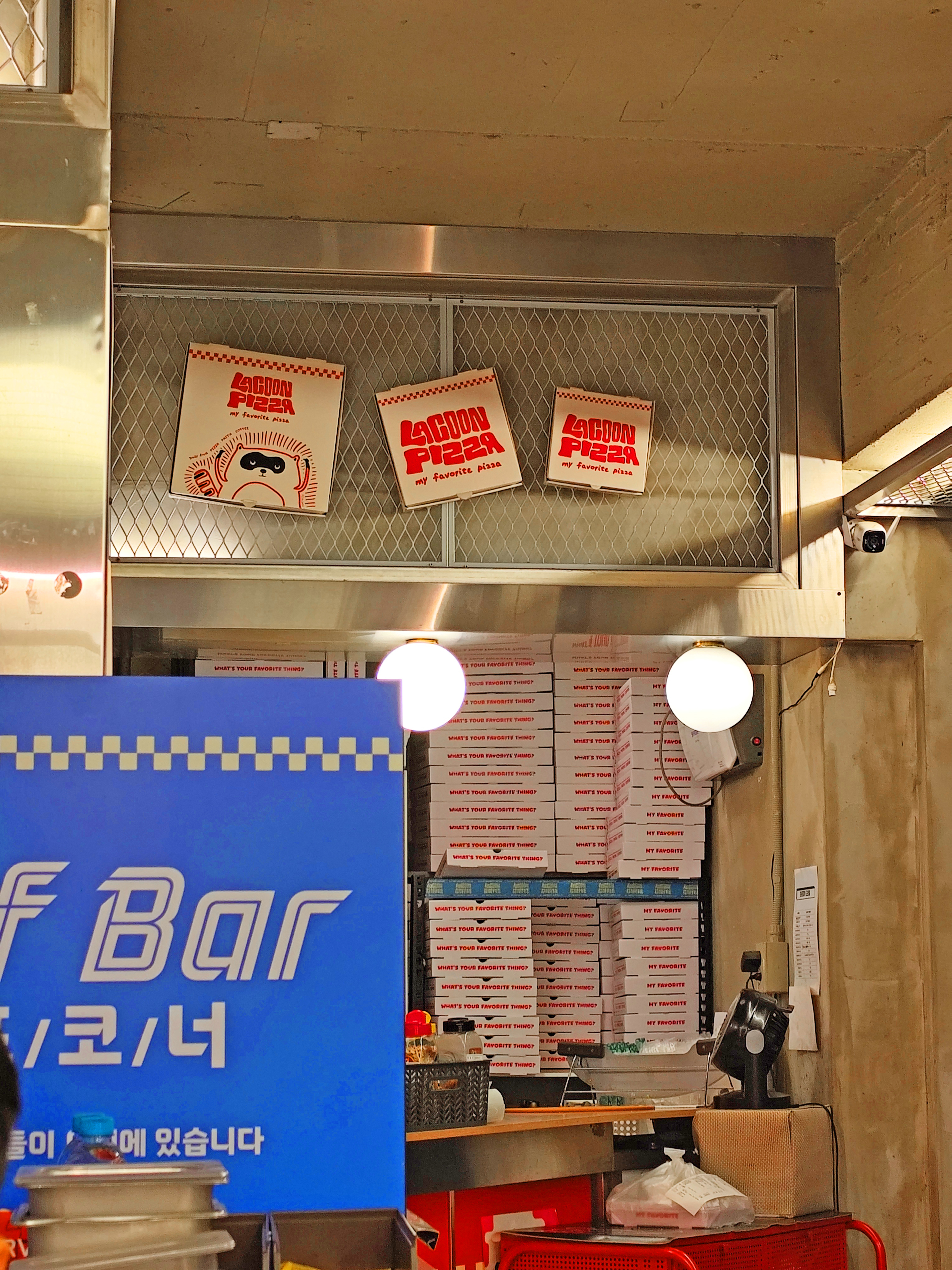 매장은 콘크리트 벽과 감각적인 네온/포스터 인테리어로 꾸며져 있습니다. 특히 벽에 붙은 라쿤 캐릭터와 레트로풍 포스터가 시선을 확 사로잡습니다. 마치 뉴욕 피자 가게에 들어온 듯한 느낌을 주는데, 사진 찍기에도 딱 좋더라고요.