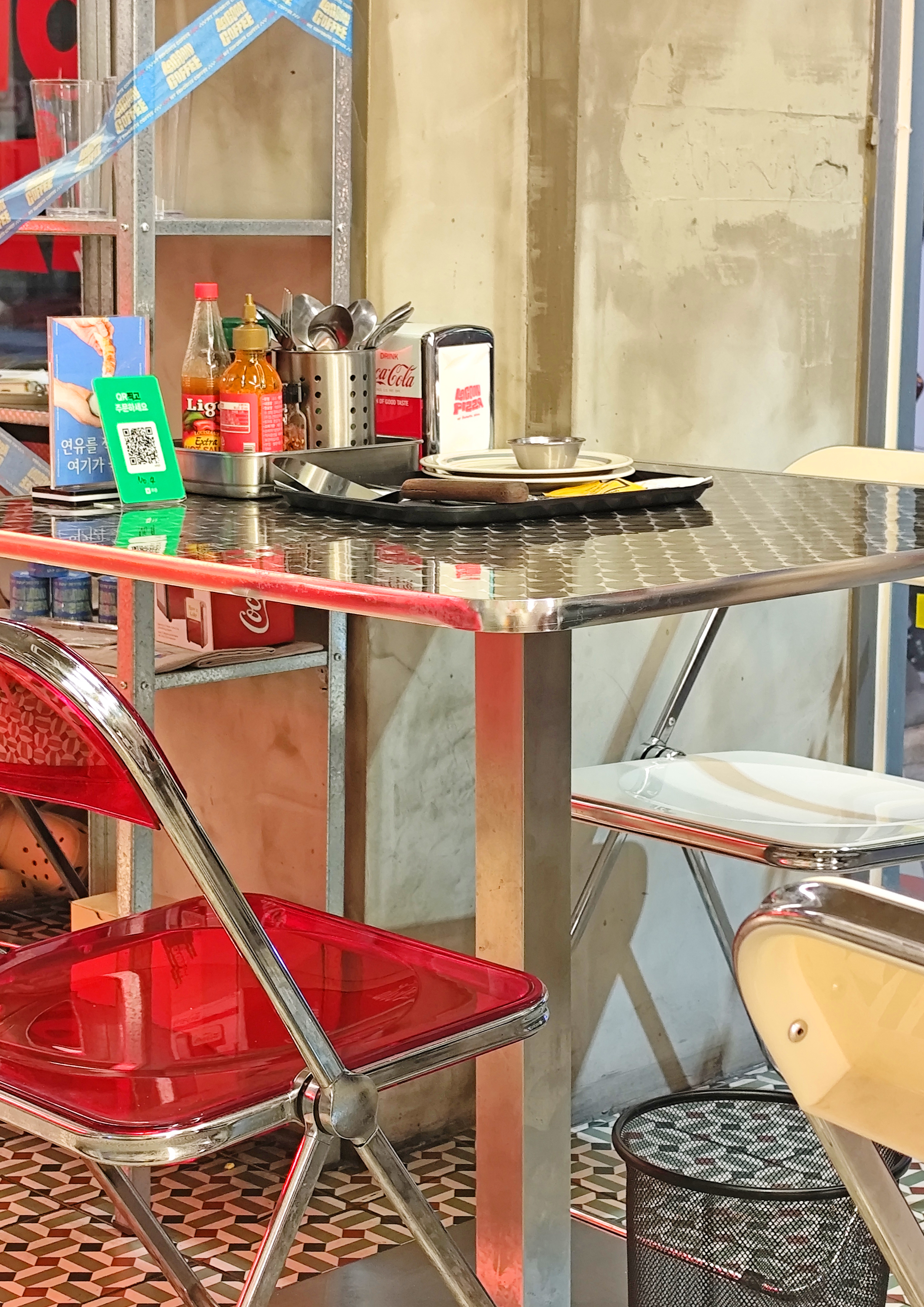 테이블은 깔끔하게 정리되어 있고, 각 자리마다 치즈가루, 핫소스, 올리브오일 등 기본 피자 토핑류가 준비돼 있어 취향껏 곁들일 수 있습니다.