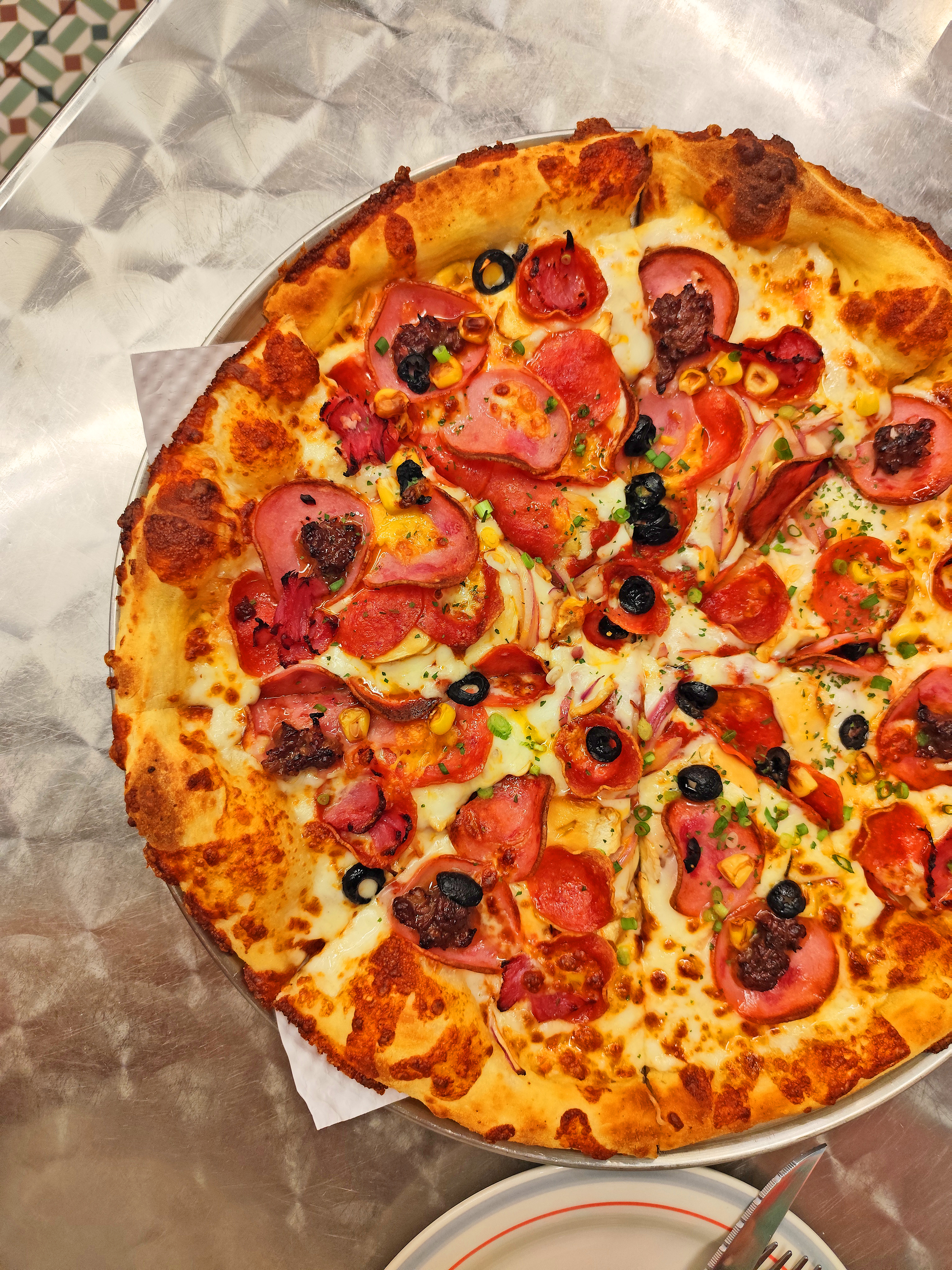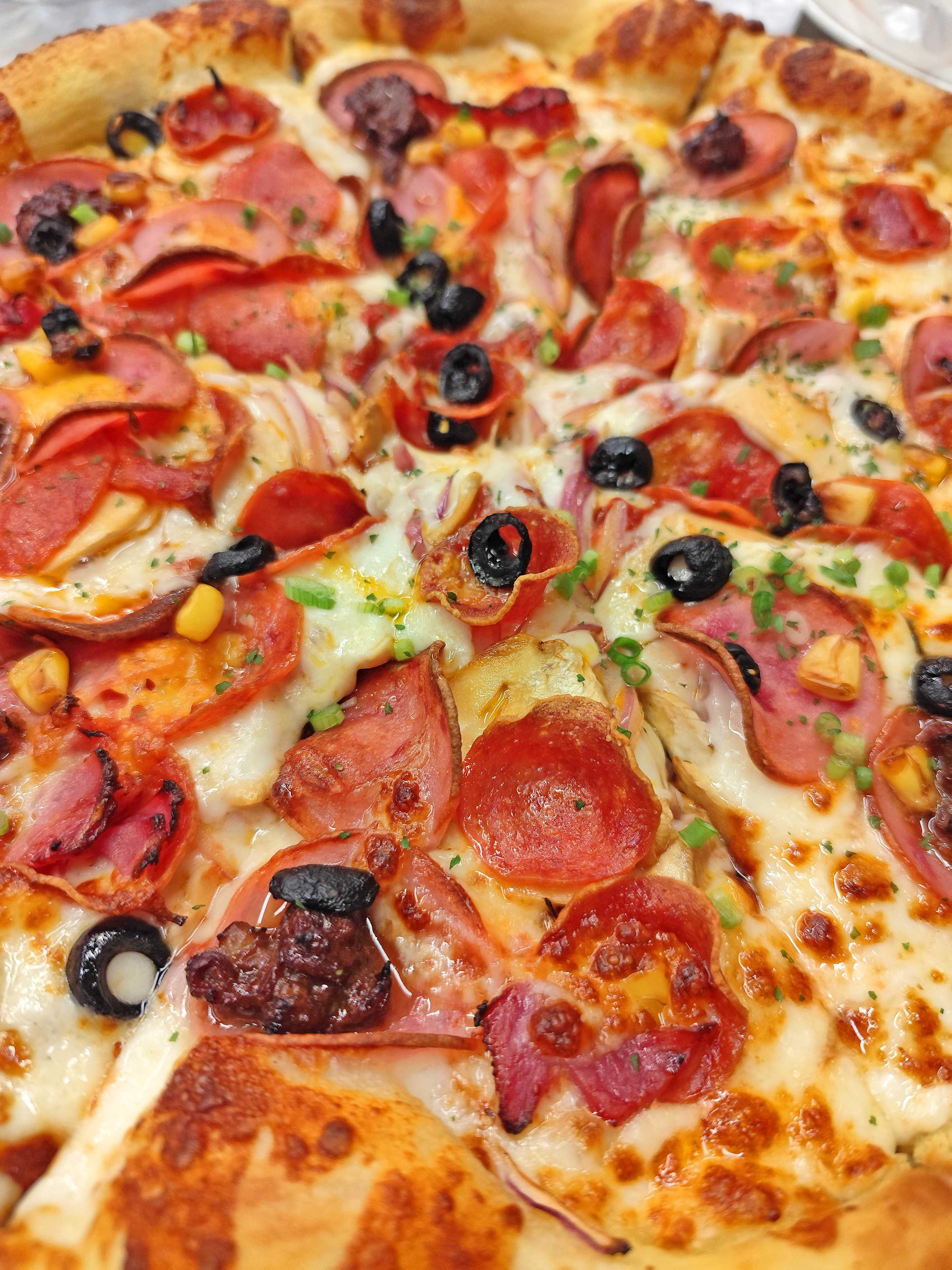 토핑은 페퍼로니, 소시지, 올리브, 버섯, 피망 등이 푸짐하게 올라가 있는데, 각각의 재료가 따로 놀지 않고 조화를 이루는 게 인상적이었어요.
